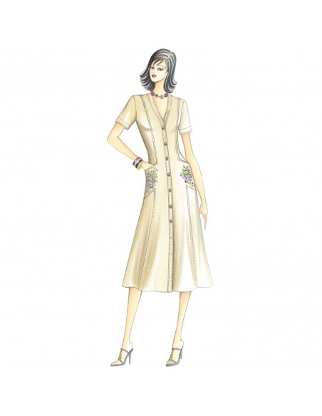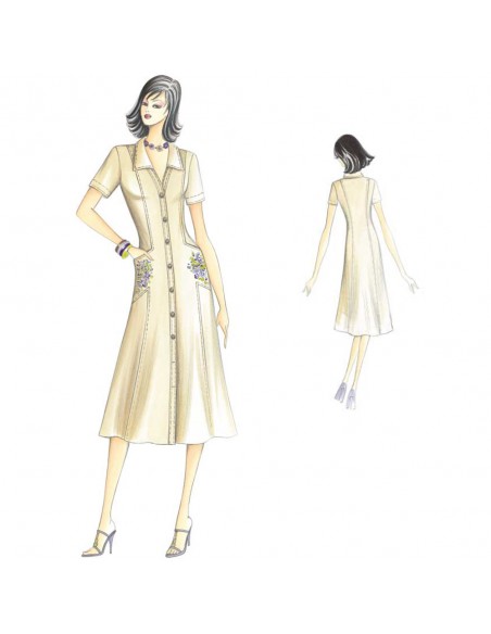 Robe manteau avec coupes qui forment les poches soulignées de broderie, ample jupe divisée en pans.