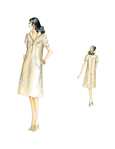 Robe chemisier de ligne évasée avec col polo fermé par une zip, coupes moulées qui retiennent un léger froncis, poches intérieures insérées dans le côté, manches ballon avec poignet façonné en pointe, empiècement sur les épaules. Réalisable en batiste ou mousseline.