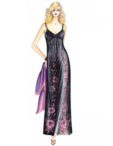 Robe combinaison près du corps de ligne légèrement évasée avec bretelles torsadées et froncis sur le corsage de ligne empire. Réalisable en mousseline de soie, mousseline, satin, tulle brodé.