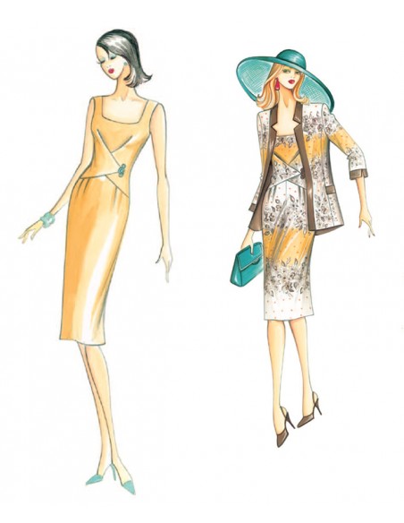 Mt. 1,40 alt. 1,40. Robe avec, sur le corsage, un motif croisé qui forme de souples pinces, et broche sur le côté.A compléter par la veste 2703.