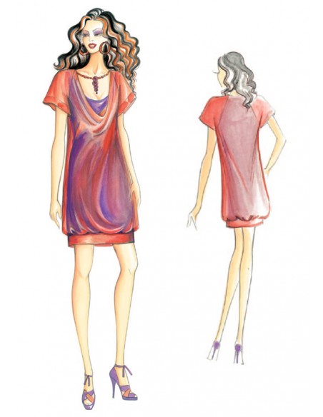 Mini-robe à réaliser en jersey de coton, ligne moulée et dessus de la robe en voile de ligne trapèze avec ourlet ballon, manches raglan, col capuchon fermé par un collier.