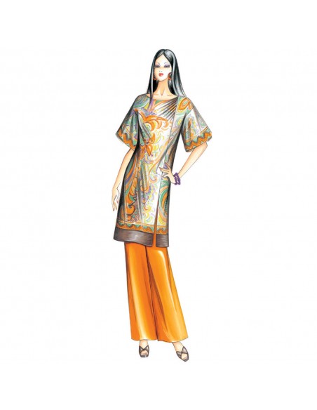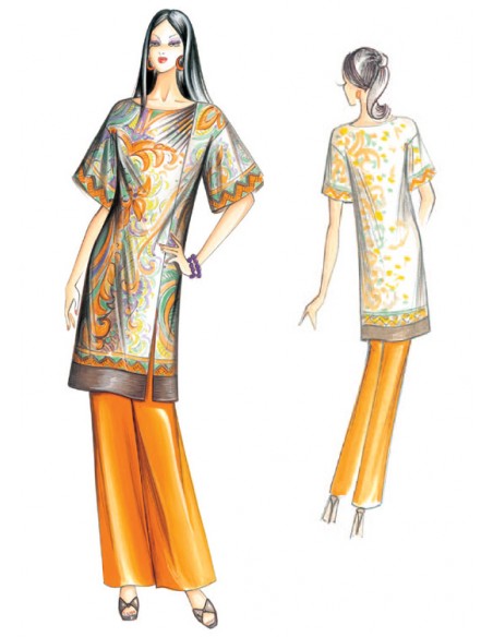 Robe style tunique avec épaules tombantes et manches courtes, encolure avec drapé latéral. A réaliser en léger foulard imprimé.