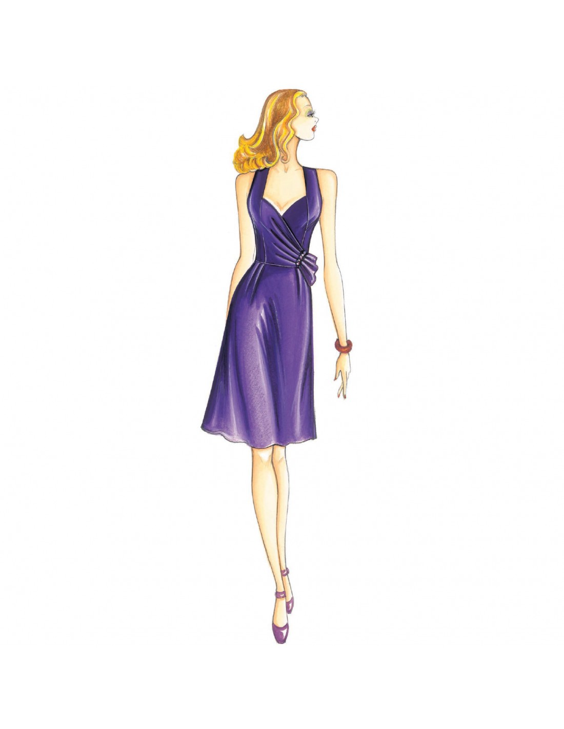 Robe style années ’50, corsage avec encolure en coeur et taille avec un drapé qui forme un noeud, jupe cloche. Tissu conseillé satin léger ou crêpe de chine.