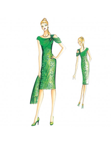 Fourreau en dentelle et satin ou jersey avec corsage drapé qui forme une boucle pour passer la bretelle.