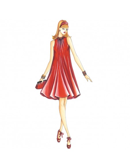 Ample robe de ligne trapèze, col officier qui retient le froncis et emmanchure à l’américaine.