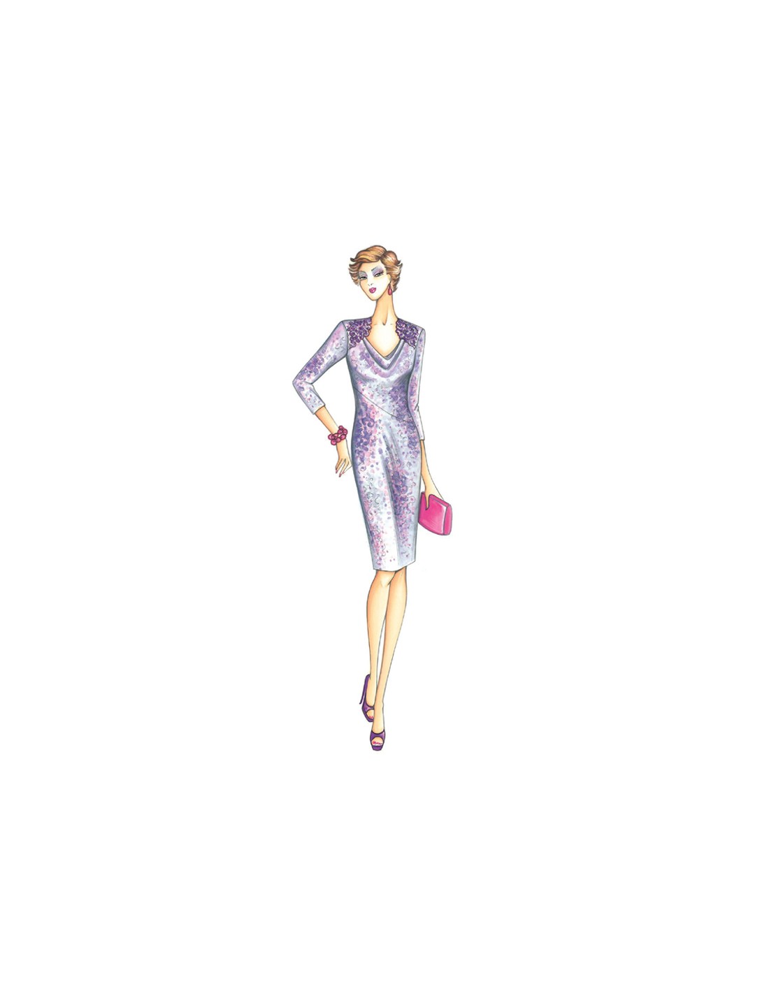 Robe fourreau avec coupes diagonales sur le corsage, col capuchon et dentelle insérée sur le côté et sur les épaules. Réalisable en satin, crêpe, crêpe de chine. Cardigan n. 3621.