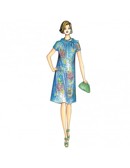 Inspiration années ’60 pour la robe de ligne trapèze au col rond qui retient un froncis, courtes manches raglan. Réalisable en soie, satinette ou jersey.