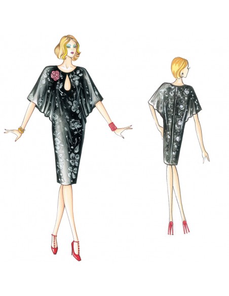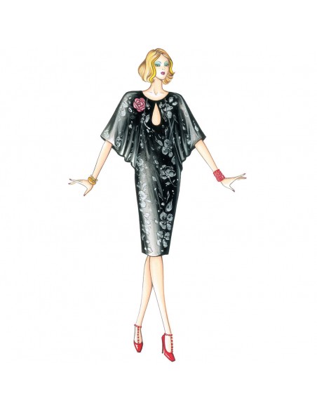 Robe aux amples manches papillon, encolure avec ouverture en goutte, conseillée en organsin ou satinette légère.