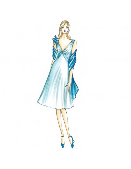 Elégante robe de coupe empire avec jeux de drapés croisés sur le corsage à ample décolleté en V, jupe à deux couches, celle du dessus fendue sur le milieu. Tissus conseillés: mousseline de soie ou de coton, jersey.