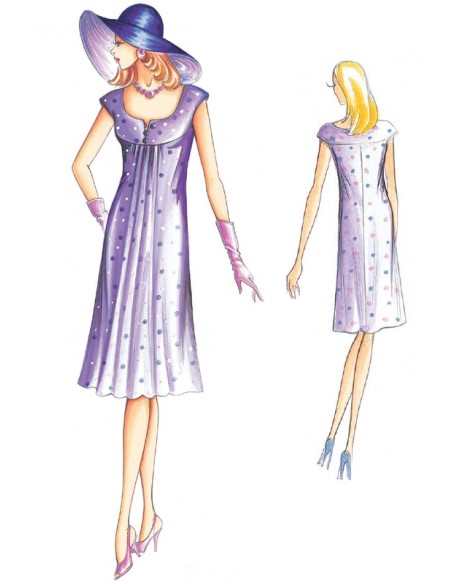 Robe trapèze de ligne fluide, empiècement qui forme manche kimono et retient le froncis qui donne de l’ampleur à la jupe en biais.