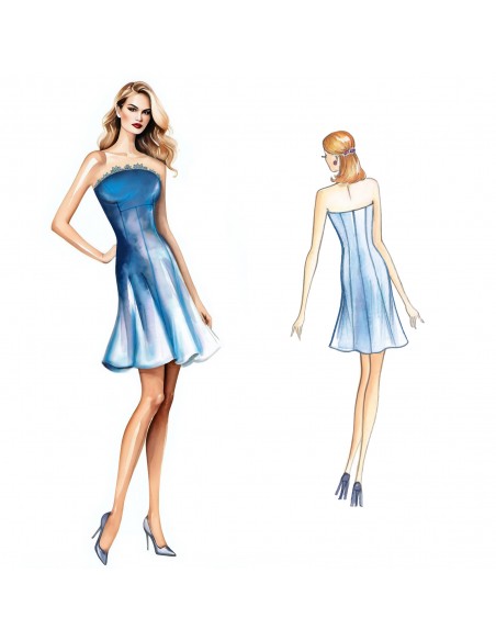 Mini-robe divisée en drapés avec une ligne modelée et évasée dans le bas, encolure arrondie vers le haut profilée par une bordure en dentelle. Tissus recommandés : crêpe, satin duchesse, faille ou faux cuir.