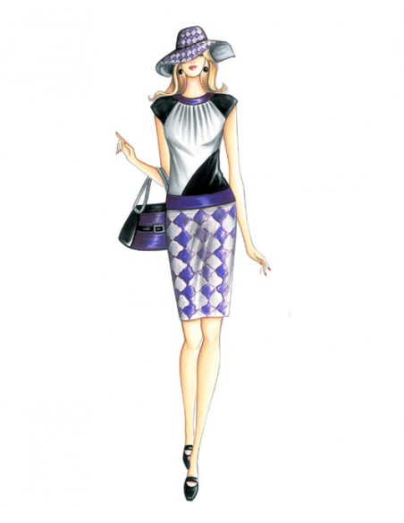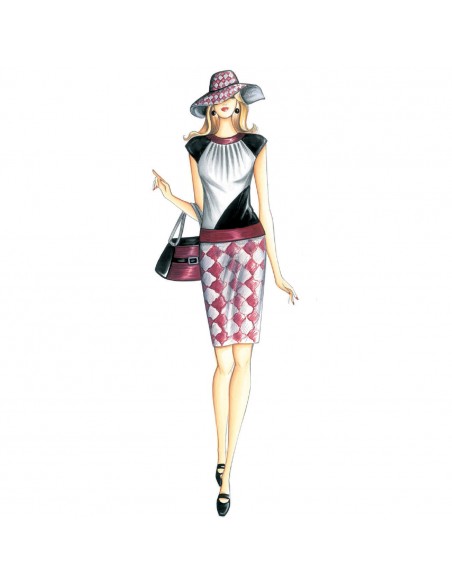 Top de ligne moulée avec de souples plis sur l’encolure, courtes manches raglan et coupe arquée sur un côté. Réalisable en crêpe de laine ou jersey de différentes couleurs ou en uni.