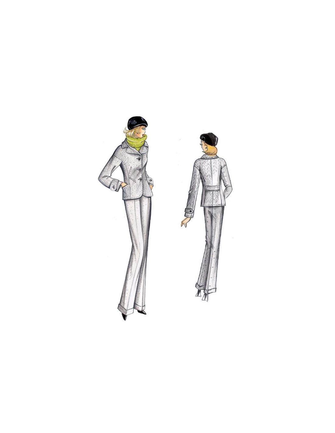 Veste à réaliser en chevron, emmanchure basse, reprises surpiquées et poches plaquées.