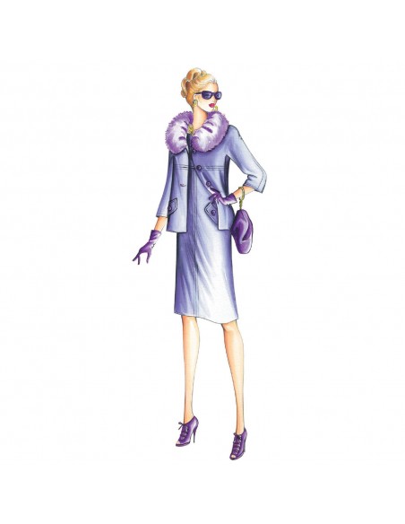 Veste de ligne droite, col de fourrure avec petits plis, manches kimono, rabats avec poches intérieures. Conseillée en double jersey ou drap de laine.