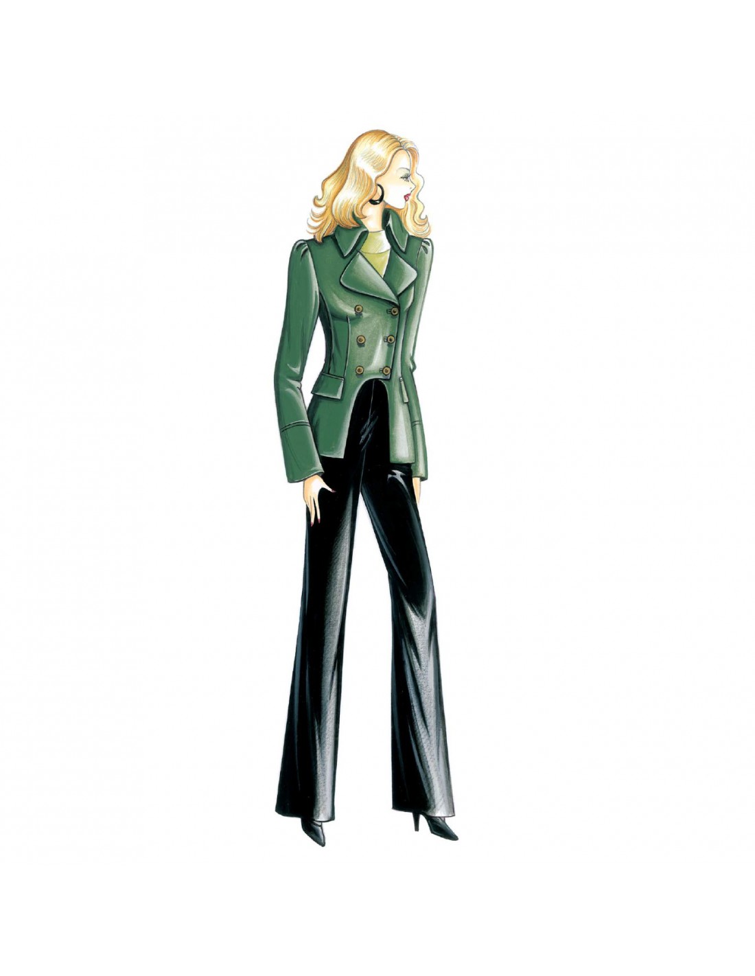Réminiscences 1700 pour la veste croisée avec ouverture arquée au bas, col Danton, manches légèrement froncées sur les épaules et évasées au poignet. Réalisable en velours lisse, vigogne ou gabardine.