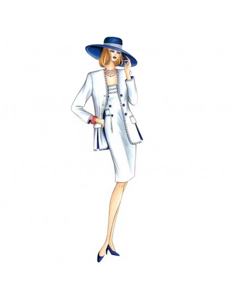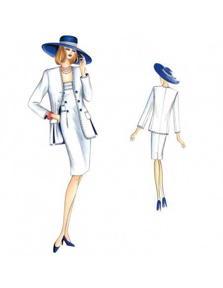 Veste de ligne mi-moulée à boutonnage simple et encolure en V, rabats appliqués sous lesquels s’ouvrent des fentes. Tissus conseillés: crêpe ou jersey épais et profils en tissu contrastant. Robe n. 6079.