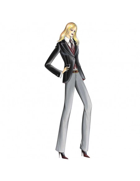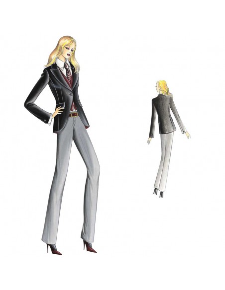 Veste droite de ligne adhérente avec une large fermeture à un seul bouton, revers en pointe et bas fuyant amplement arrondi. Pantalons n. 1058.