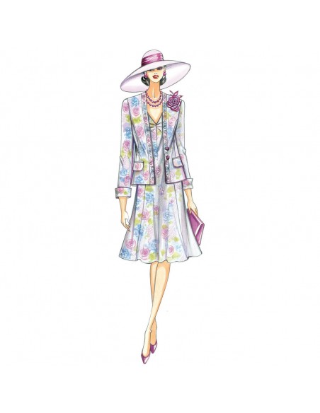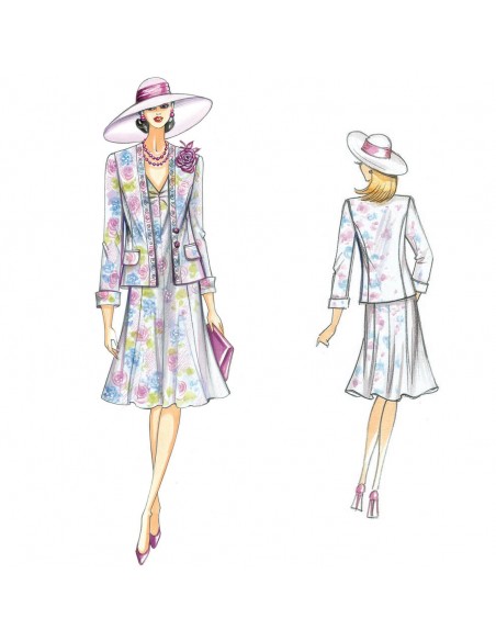 Veste à réaliser en satin fantaisie, ligne semimoulée, fermeture à deux boutons. Robe à lés évasés n. 9418.