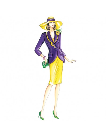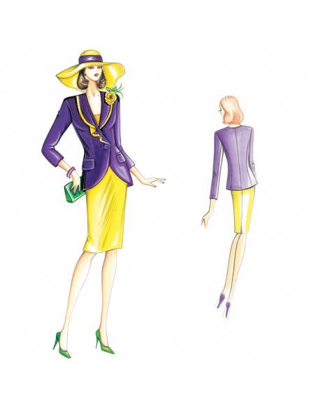 Veste de ligne moulée avec un élégant double col châle qui forme un volant retenu sur les épaules, ourlet arrondi et fermeture avec un seul bouton. Conseillée en crêpe et sous-col en organdi léger ou mousseline de soie.