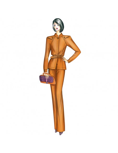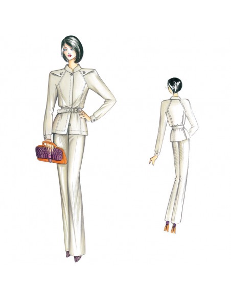 Veste chemisier avec manches raglan, col officier et de particulières épaulettes rabattues avec un petit bouton, coulisse dans le dos et ceinture superposée. Pantalons droits n. 3110.