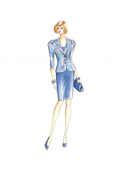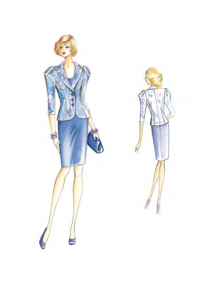 Veste de ligne moulée à boutonnage simple, manches ¾ avec de souples plis sur les épaules; col à revers pointus et coupes surpiquées. Tissus conseillés : satinette, jersey double, crêpe, denim léger.