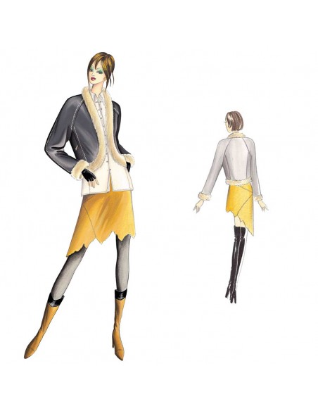 Des surpiqûres en zigzag parcourent la courte veste arrondie au bas et bordée de fourrure, manches raglan et poches intérieures fermées par une zip insérées dans la coupe du côté. Réalisable en cuir ou tissu ciré rembourré. Jupe n. 8867. Blouse n. 8859.