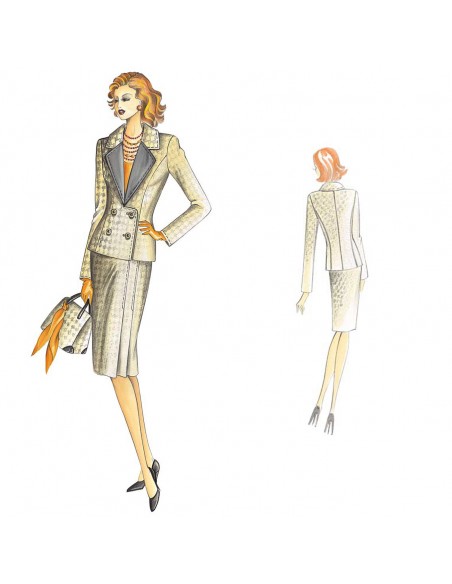 Veste croisée à col simple avec revers classiques à réaliser en tissu satiné ou uni. Tissus recommandés : pied-de-poule ou bouclé. Jupe n° 9662.