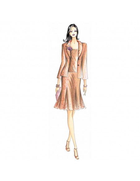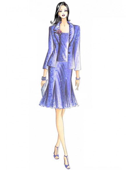 Veste droite de ligne semi-moulée avec un original double col froncé ouvert sur un seul revers, manches 3/4. Réalisable en cady, satin ou shantung.