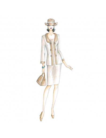 Fermeture dégagée pour la veste de ligne milâche avec boutons appliqués sur le fourreau, bordure en tissu contrastant comme le col. Réalisable en double jersey, crêpe, flanelle.