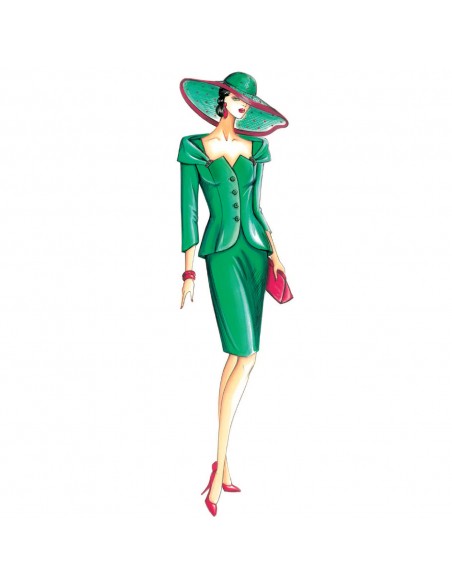 Elégante veste de ligne moulée avec petite basque en corolle, large encolure à garnir d’un col châle détachable. Tissu conseillé double satin de soie ou satinette à pois.