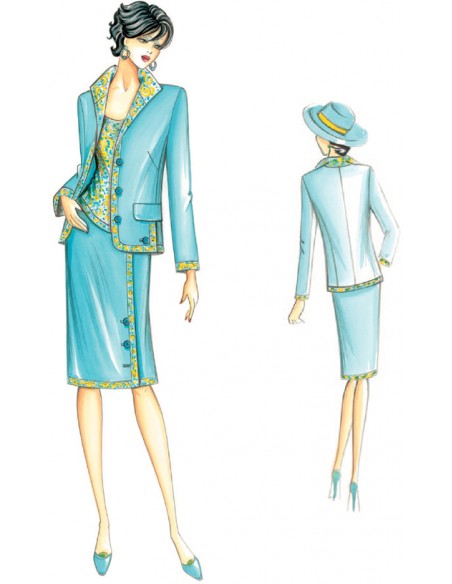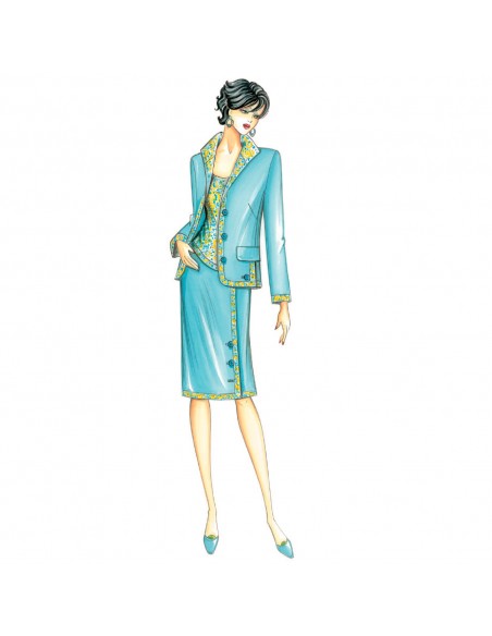 Mt. 1,60 alt. 1,40.Veste avec col à pointes relevées, bas arrondi et petite fente avec un bouton. Conseillée en jersey ou crêpe-satin et doublure en soie fantaisie.A compléter par la jupe 2740.