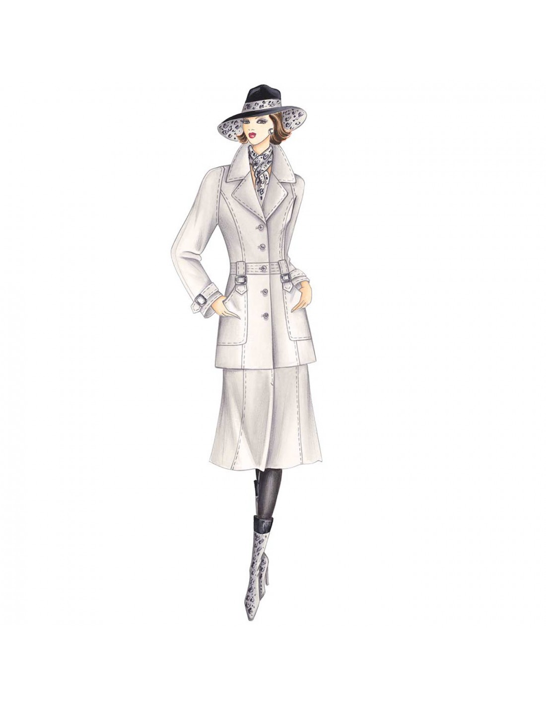 Veste droite de ligne moulée avec ceinture insérée qui retient les bandes fermées par une boucle sur les poches plaquées, manches semi-raglan et col sportif. Réalisable en gabardine, tissu technique imperméabilisé ou ciré, cuir ou daim. Jupe n. 8438.