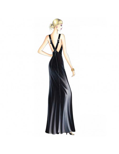 Abito a sottoveste con pannelli drappeggiati trattenuti da bretelle con fibbia che si incrociano sulla schiena e si uniscono ai teli della lunga gonna svasata. Realizzabile in cady leggero, jersey, crêpe, satin.