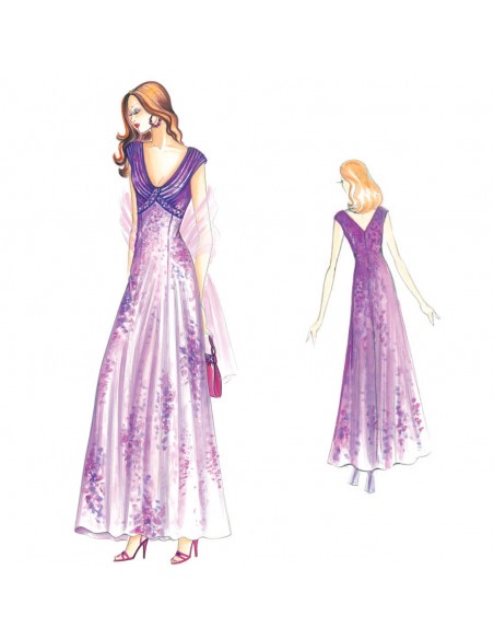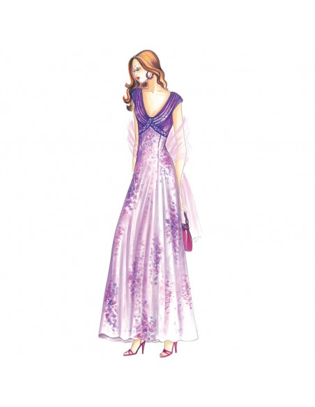 Abito lungo con taglio impero e bordo che trattiene il collo fittamente arricciato, gonna divisa in teli ampi. Consigliabile in mussola o rasatello.