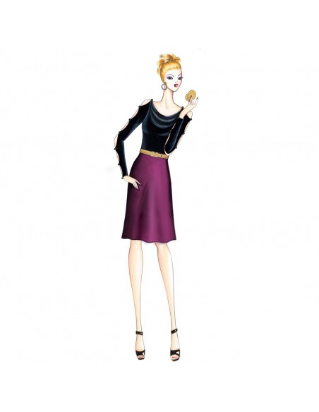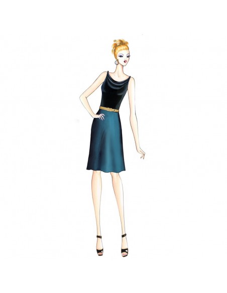 Abito con morbido collo a cappuccio, maniche con fessure e gonna a godet. Realizzabile in crêpe e voile.