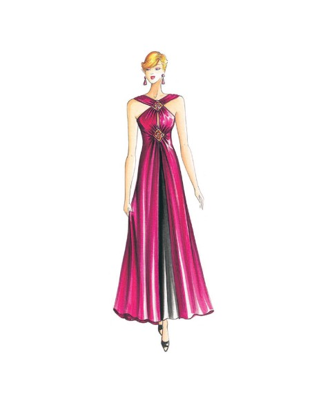 Elegante abito da realizzare in voile o garza di seta con gonna a godet e sopragonna, corpetto drappeggiato trattenuto da rombi ricamati in perle e strass.