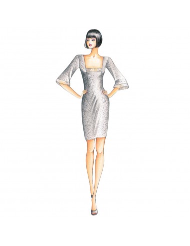 Tubino da realizzare in tessuto a paillettes, maniche svasate con bordo in organza o chiffon.