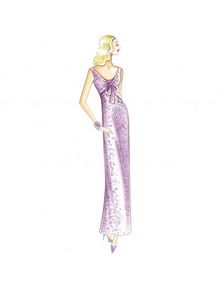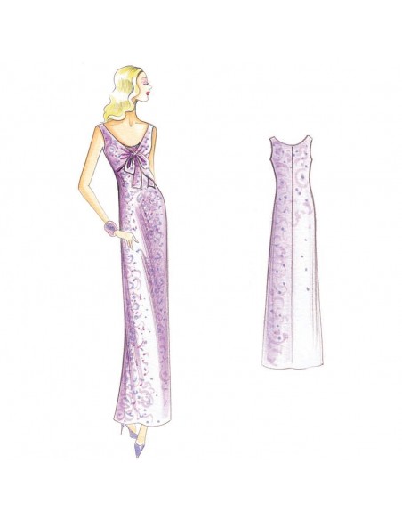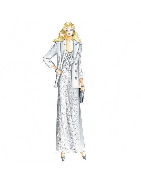 Abito di linea diritta consigliabile in chiffon con corpetto drappeggiato che forma fiocco. Giacca doppiopetto di linea diritta consigliabile in raso n. 2290.