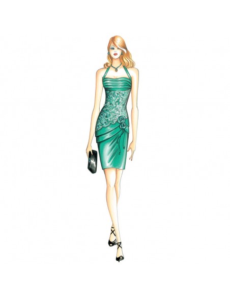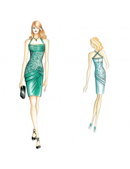 Sofisticato tubino da realizzare in raso e pizzo, giochi di pieghe alla scollatura, gonna con pieghe diagonali e rose in tessuto.
