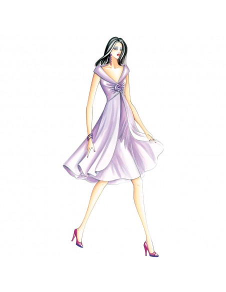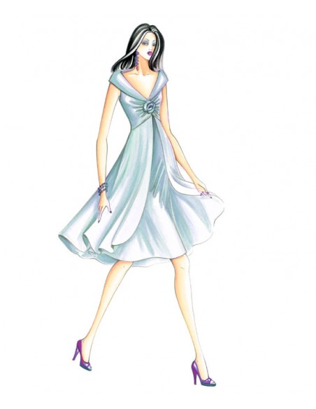 Elegante abito da realizzare in crêpe e chiffon, ampia scollatura con collo sciallato, punto vita rialzato sul davanti che trattiene la sottogonna a godet e la sopragonna più ampia con fianco intero.