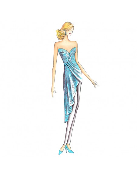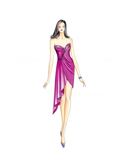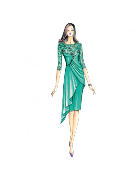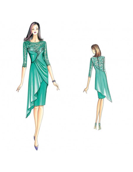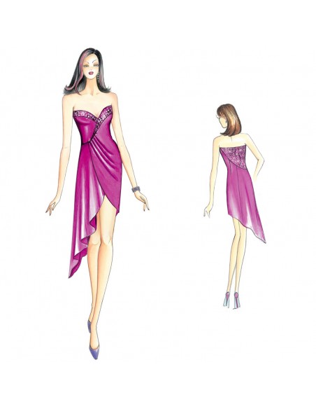 Elegante abito asimmetrico con pannello laterale drappeggiato e scollo a cuore, realizzabile in due versioni: con gonna a tubino sottostante e carré in pizzo o chiffon, oppure come mini abito a décolleté. Tessuti consigliati: crêpe, satin o jersey.