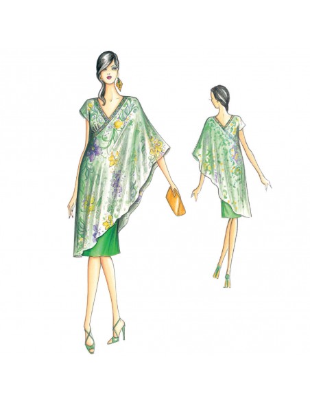 Effetto sari per il raffinato abito a sottoveste da realizzare in raso-satin su cui si sovrappone la cappa asimmetrica stondata che scende diagonalmente, in voile, chiffon o seta fantasia.
