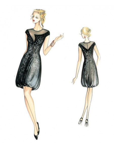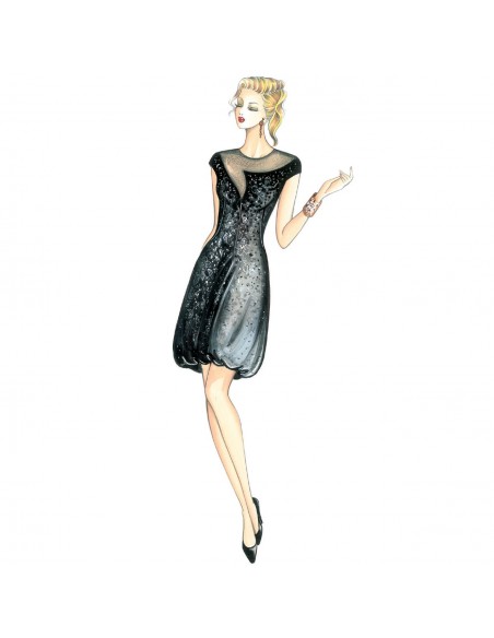Abito consigliabile in satin o damascato, ampia scollatura in organza o chiffon, gonna ripresa al fondo che crea effetto a palloncino.
