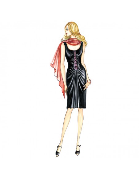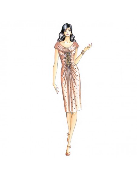 Abito con morbidi drappeggi che ammorbidiscono la silhouette, applicazioni di ricamo o pizzo rebrodé e collo che termina a V sul dorso. Consigliabile in crêpe o voile.
