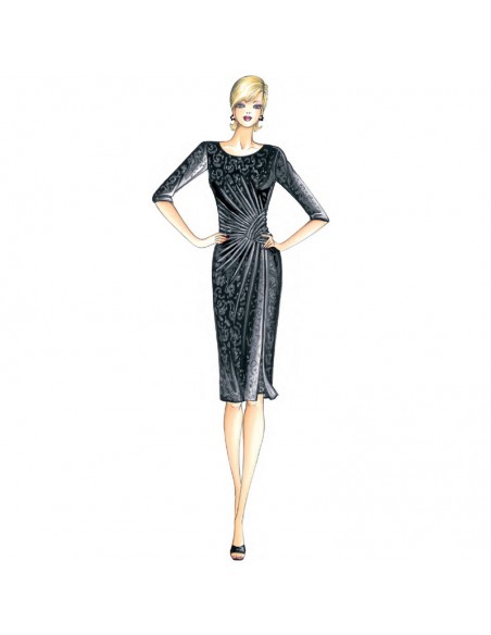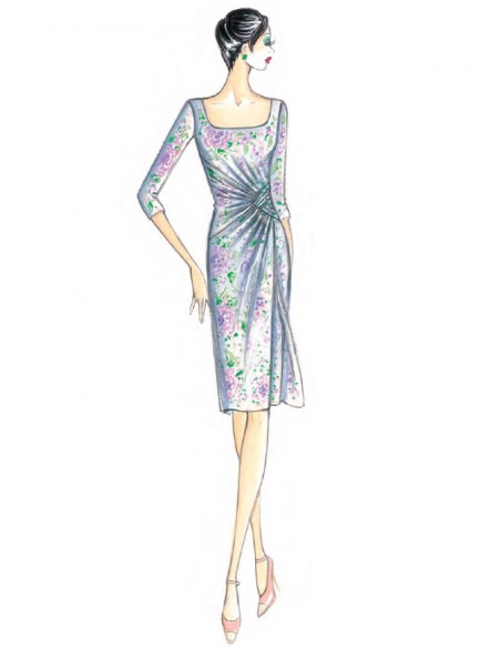 Abito drappeggiato da realizzare in crêpe o jersey, gonna con spacco laterale con mezza sottogonna fermata sui fianchi.