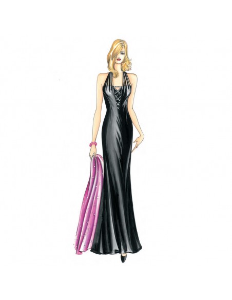 Abito lungo di linea a sirena in chiffon o crêpe con collo all’americana drappeggiato e profonda scollatura a V fermata da stringhe incrociate in strass, completo di mini sottoveste a décolleté anche nel dorso in crêpe o raso.