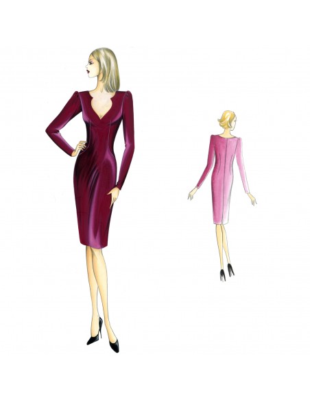 Tubino con originale scollatura a cuore e spalle arricciate. Tessuti consigliati: velluto liscio o crêpe.