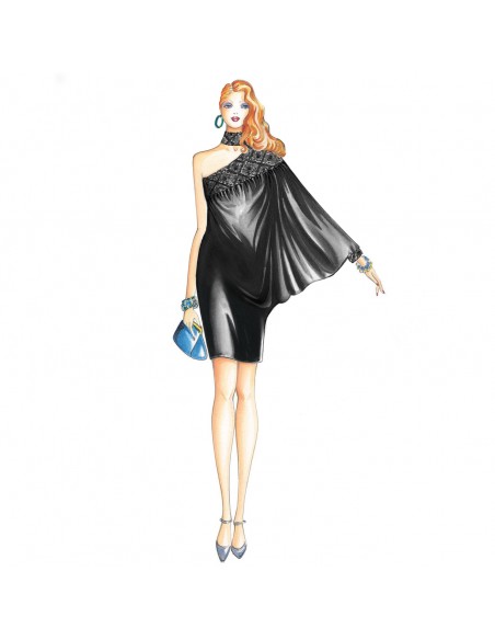 Mini abito monospalla con singola ampia manica a farfalla, da realizzare in jersey di viscosa, satin o georgette con carré asimmetrico in velluto ricamato, pizzo o strass.