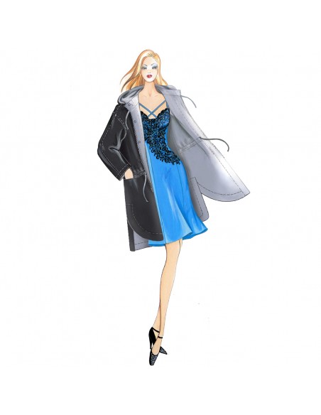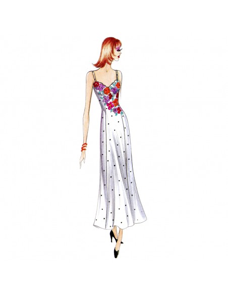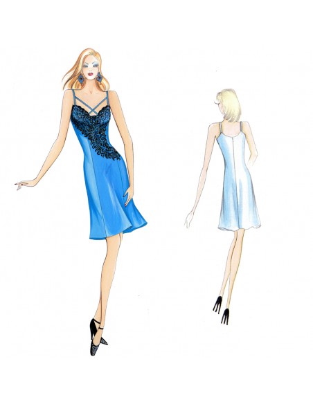Abito-sottoveste realizzabile in raso con motivo a listelli incrociati sul décolleté e inserto in pizzo che scende diagonalmente verso il fianco. Parka n. 7035.