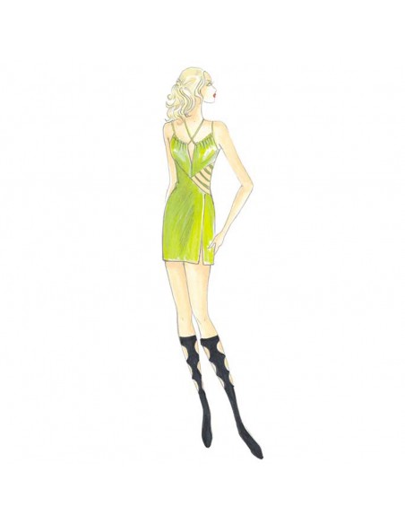 Abito sottoveste consigliabile bicolore o interamente tinta unita, ricamo multicolore e gonna con spacco. Realizzabile anche in versione mini con tubolari al fianco che lasciano intravedere il nudo.